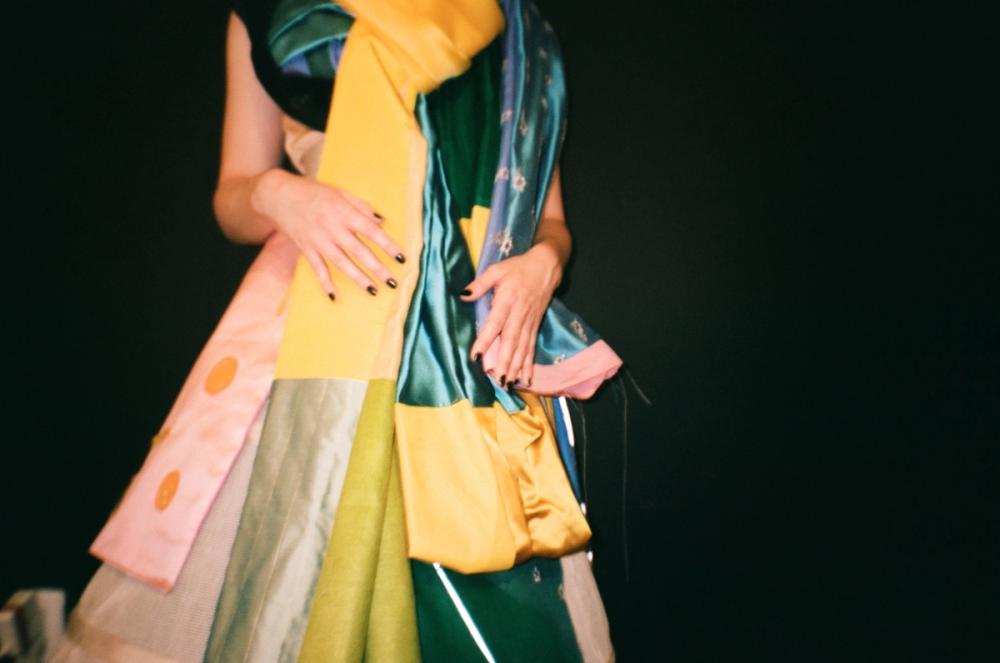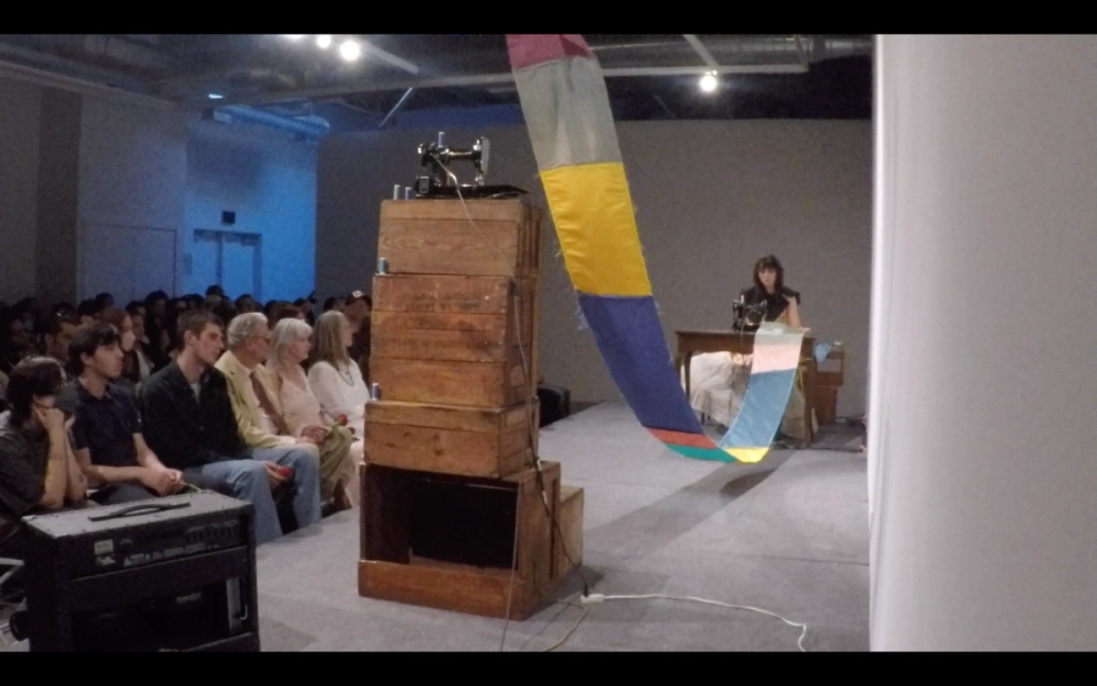 In 2020 Nicole Cooke’s brother passed away unexpectedly at the age of 24. Since then, Cooke’s art practice, which combines elements of music, performance, and fashion, has evolved to help her reckon with profoundingly isolating grief. Recital II My Brother is a live performance inviting the audience to witness a transmission between two singing sewing machines that metaphorically represents the artist’s unbridled connection to her brother which exists in a place beyond time, space, and mortality. The antique sewing machines used in the performance both belong to Cooke: the one that she sews on is her personal machine while the other, perched on a stack of crates, was used by her brother up until his death. A single blue thread flows from the “brother machine”, feeding Cooke’s machine as she sews a patchwork silk scarf that is 24 feet in length-- one foot for each year of her brother’s life. The image of a lone strand of thread slowly plucked from an unfurling spindle is reminiscent not only of the Fates, but also of the work of Spanish Surrealist artist Remedios Varo which inspired many of the visual cues in Cooke’s performance. 1