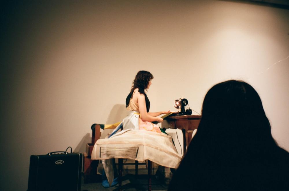 Remedios Varo is perhaps most well-known for her paintings of women sewing in grand settings imbued with celestial symbolism. In her 1956 painting Armonia, a figure seated at a sewing table operates a giant musical stave made of golden bars, while a goddess-like being emerges from the wall behind her to touch the apparatus. To Cooke, music is the most universal art form because of its ability to transcend time and viscerally connect people— two strangers upon hearing the same song may feel the same emotions though they have nothing else in common. In that sense music acts as a salve to grief which is a state of eternal, unrelenting solitude. In Recital II My Brother, contact microphones pick up on the minute sounds made by the sewing machines which are then fed through effect pedals and amplified. As Cooke sews according to an intricate notation of gestures she created as a “score,” nuances in the sounds -- her machine’s steady, vital rhythm like a heartbeat and the brother machine’s ethereal harmonic sounds-- are ultimately left up to chance. A space opens and the music arranges itself within it. A specific arrangement of sounds can never be exactly recreated, as it is inextricable from the moment the notes are stitched onto the scarf in blue thread that passes through the brother machine. The same fine silks that make up the scarf are used in the garments that Cooke made for herself to wear: a patchwork dress and coattails worn with an oversized crinoline. The stately clothing acts as a layer of protection, allowing her to enter into a highly vulnerable and intimate realm where, for a few moments, the intangible is within reach.